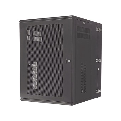 Gabinete de montaje en pared construido en acero, soporta 18 unidades de Rack para equipos de red activos o pasivos. Cuenta con paneles laterales totalmente desmontables y esta diseñado para permitir el control de clima adecuado para uso con diversos equipos de red, así como Switches de alimentación remota (PoE) y fuentes de alimentación ininterrumpida (UPS).